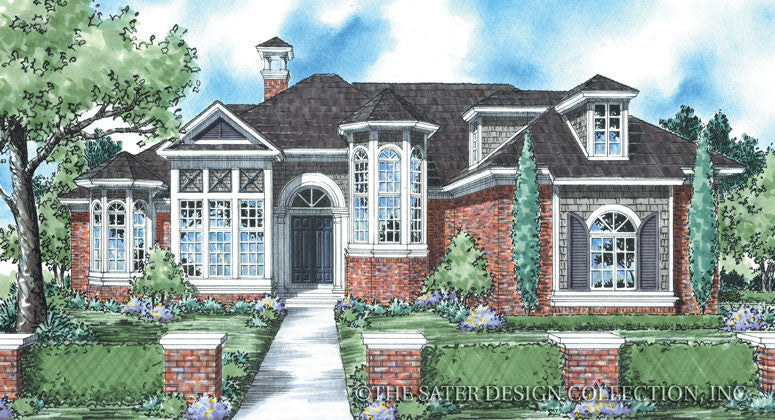 The Medoro plan has fretwork detail, shutters and bay windows embellished with a subdued brick facade influenced by the historic cottages of rural France. The Medoro plan is definitely designed for present-day lifestyles. The sophisticated arrangement of interior spaces permits the center of the home to flex easily from private to public use. Beamed and coffered ceilings enrich the amenities shared by the great room and formal dining room. There is an entertainment center, built-in shelves and an extended hearth fireplace.