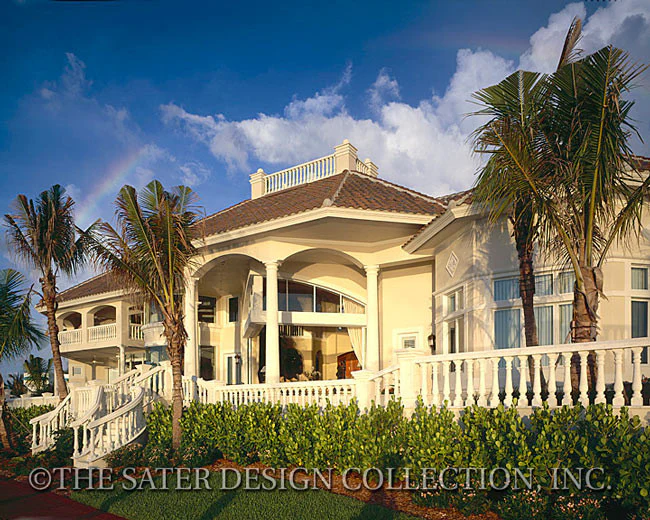 This spectacular home, the Milano, was designed to take full advantage of a waterfront location. Curved glass walls expand interior spaces and grant full view of nature's splendor. With glamorous curves and varied angles, Milano is certain to match the views wherever it is built. Grand, stately columns and cast stone balusters line the plan's masterful design, accenting its breathtaking views.