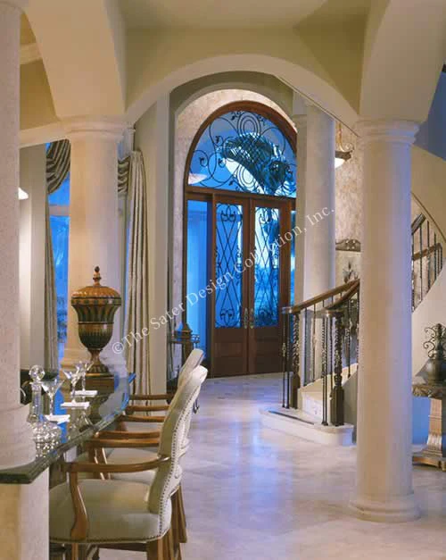 A stepped ceiling provides definition for a grand foyer that opens to the central interior. Designed to deliver a sense of welcome, the Trissino home maintains an airy, outside-in disposition throughout the interior. Massive striated columns form the inner perimeters of the formal spaces, and establish a natural theme that is reinforced by the use of myriad woods, polished marble and granite throughout the home.